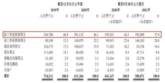 2019年、2020年,薇美姿线下渠道的推广开支占总销售费用的比例近半,到了2021年才有所下降。