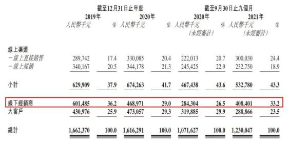 2020年,由于疫情的影响,薇美姿向线下经销商销售的收入占比由2019年的36.2%降低至29%,2021年1-9月虽没有完全恢复,为33.2%,但仍是占比最高的渠道。