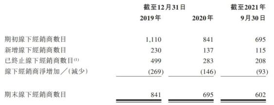 2021年1-9月期内新增115家,终止合作208家,净减少93家,占期末经销商总数量的约15%。