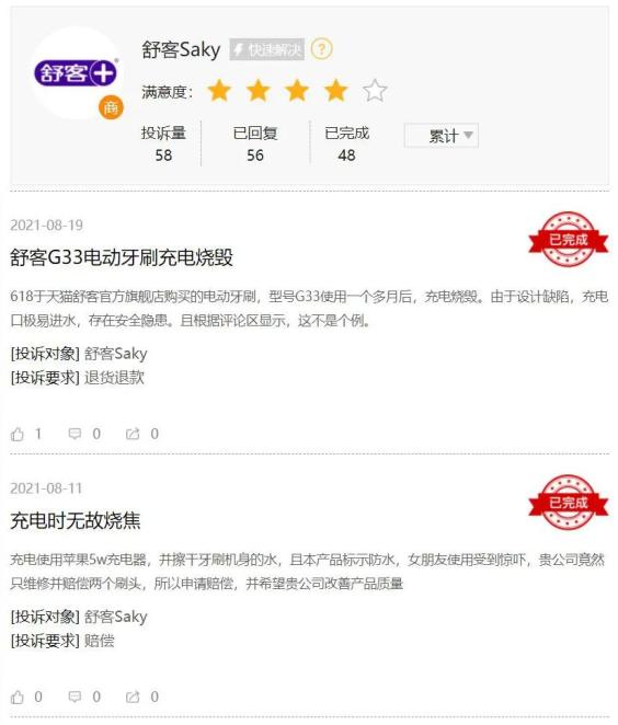 黑猫投诉平台上,关于舒客的投诉共有58条,其中有超过10条投诉均表示舒客的电动牙刷存在缺陷,充电口容易进水,造成充电时短路起火,存在安全隐患。