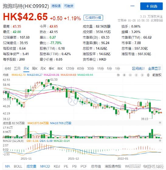 一面要建设主题乐园,一面与肯德基联名,泡泡玛特行动不断,但在二级市场的表现确实有些不太理想。据雪球网数据显示,泡泡玛特在1月20日股价迎来52周最低点每股39.15港元,相较于最高点每股107.6港元下降一半还多。