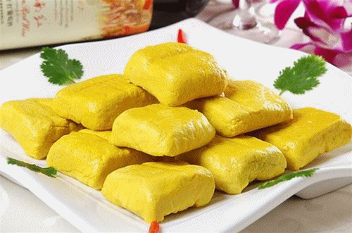 煎酿樟市黄豆腐,就是将制成的黄豆腐沿对角线切成两半,酿入肉馅,焖熟或放入油锅中炸熟即可。