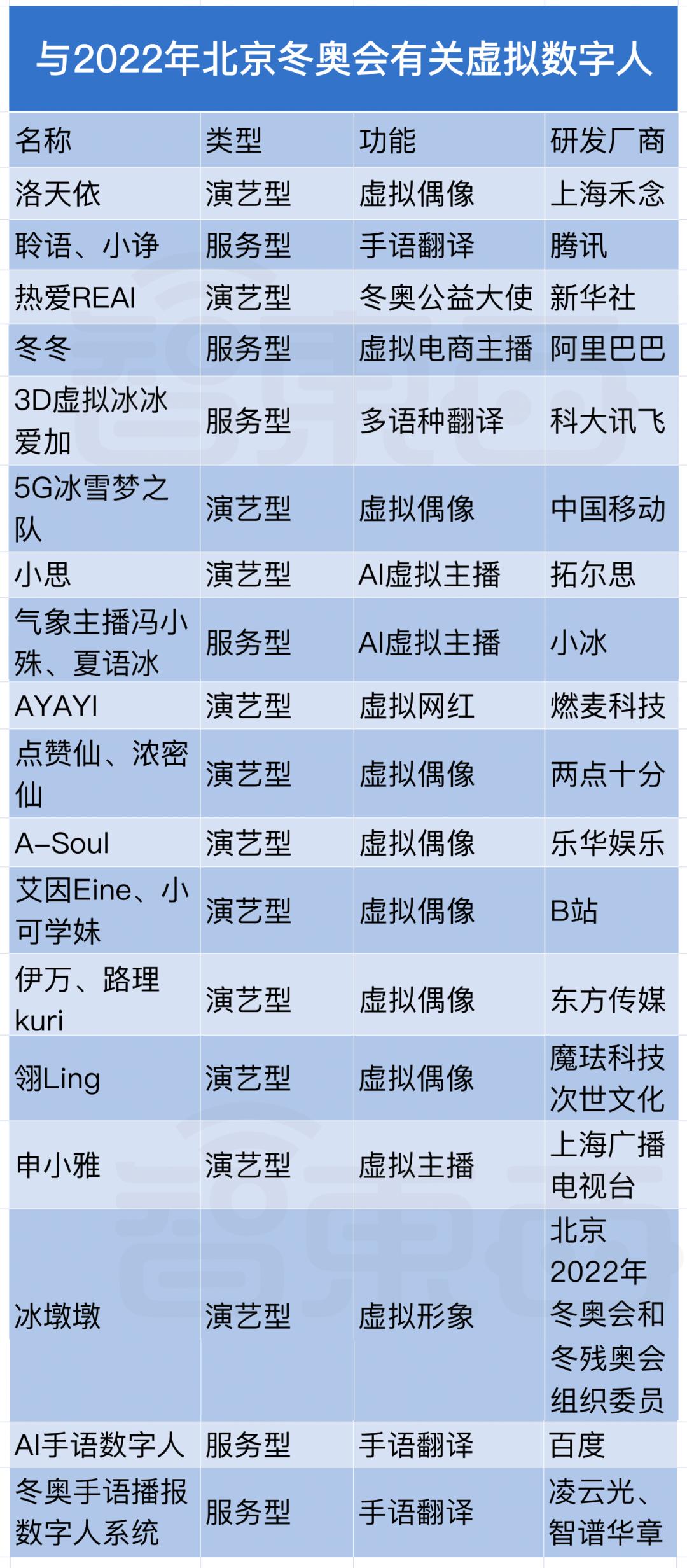 除了这类身份型虚拟数字人,功能型虚拟数字人同样受到不少厂商的欢迎。腾讯、小冰、百度纷纷带着自己的虚拟数字人在冬奥会上“露一手”,手语翻译、电商带货、天气播报等各种类型的虚拟数字人开始“卷”起来了。