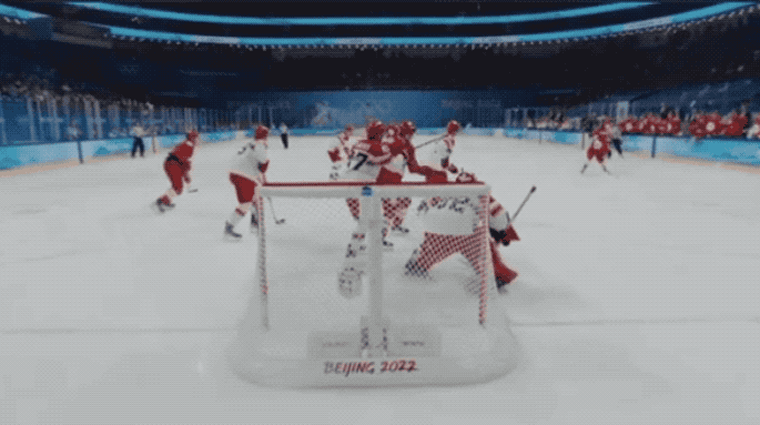 当进入到相关页面后,我看到画面的正前方是一个虚拟的VR大屏,就像现场的大屏一样,可以观看到比赛的细节和回放。镜头随后会转到运动选手身上,我可以看到他们从起点出发的动作,随后画面会随着场上赛事的节奏自主切换角度,我也尝试自己调整观看角度,甚至我能看到他们击中冰球入门的手势动作。