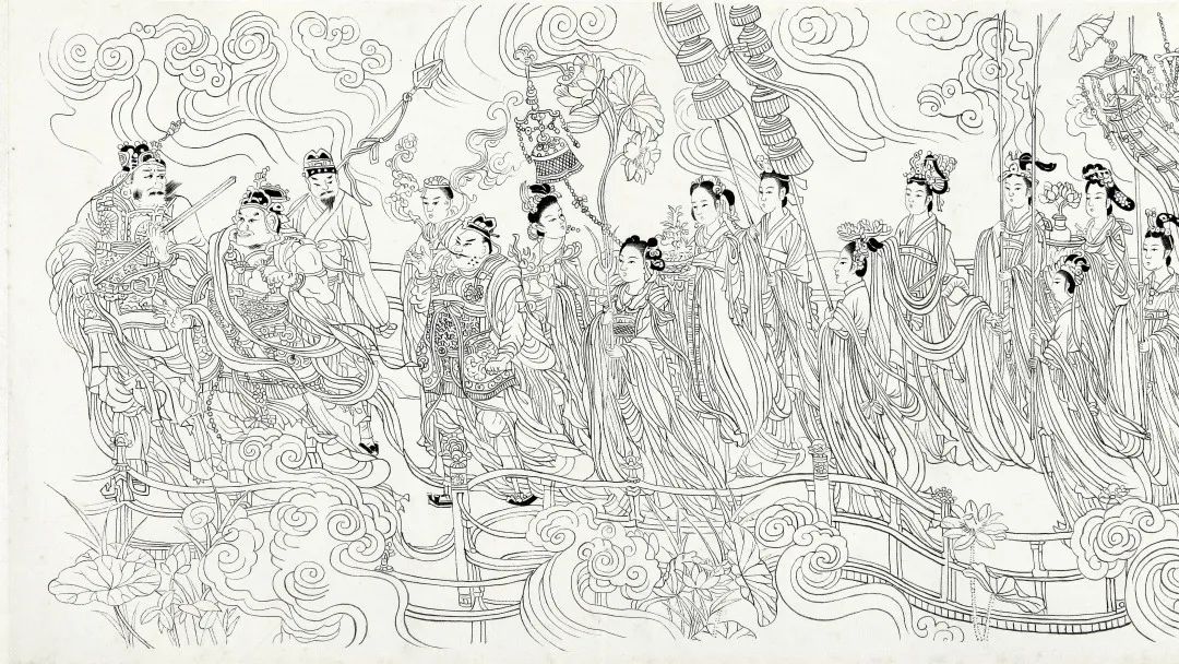 原画图中的行列原本应由八十八位神仙组成,但却少了第一位的神将,描绘了五方帝君和众仙去朝见道教最高天神元始天尊的情景。画面以单纯的线条描绘道教八十七位神仙从天而降,由右向左列队行进的盛大场面。队伍里,帝君、神仙形象端庄,神将威风凛凛,衣裙随风飘拂,队列连绵不断;仙女执各种乐器簇拥而行,手持琵琶、竹笛、芦笙、腰鼓等乐器,边走边奏,画面阵容蔚为壮观。