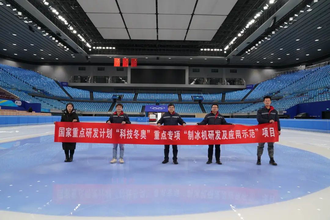 科技冬奥专项“制冰机研发及应用示范”项目部分成员在首都体育馆冰场合影。制冰机:人工冰场建设的幕后“神器”