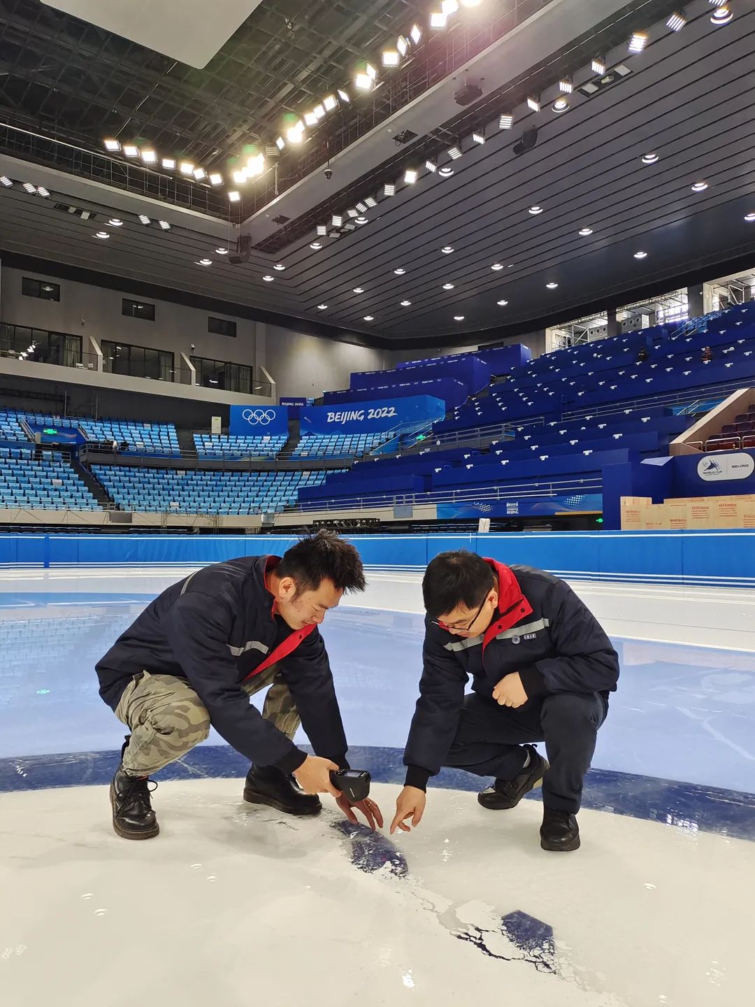 项目组成员在测量冰面温度。不同比赛项目,对冰场也有不同要求。以冰温来说,花样滑冰一般要求冰面温度-3.5度,这样冰面比较软,运动员在空中旋转三周或四周后,落冰的冲击力不至于太大。短道速滑一般要求冰面温度-6.7度到-7度,冰面相对硬一些。太软,不利于冰刀抓地;太硬,冰面又比较脆。