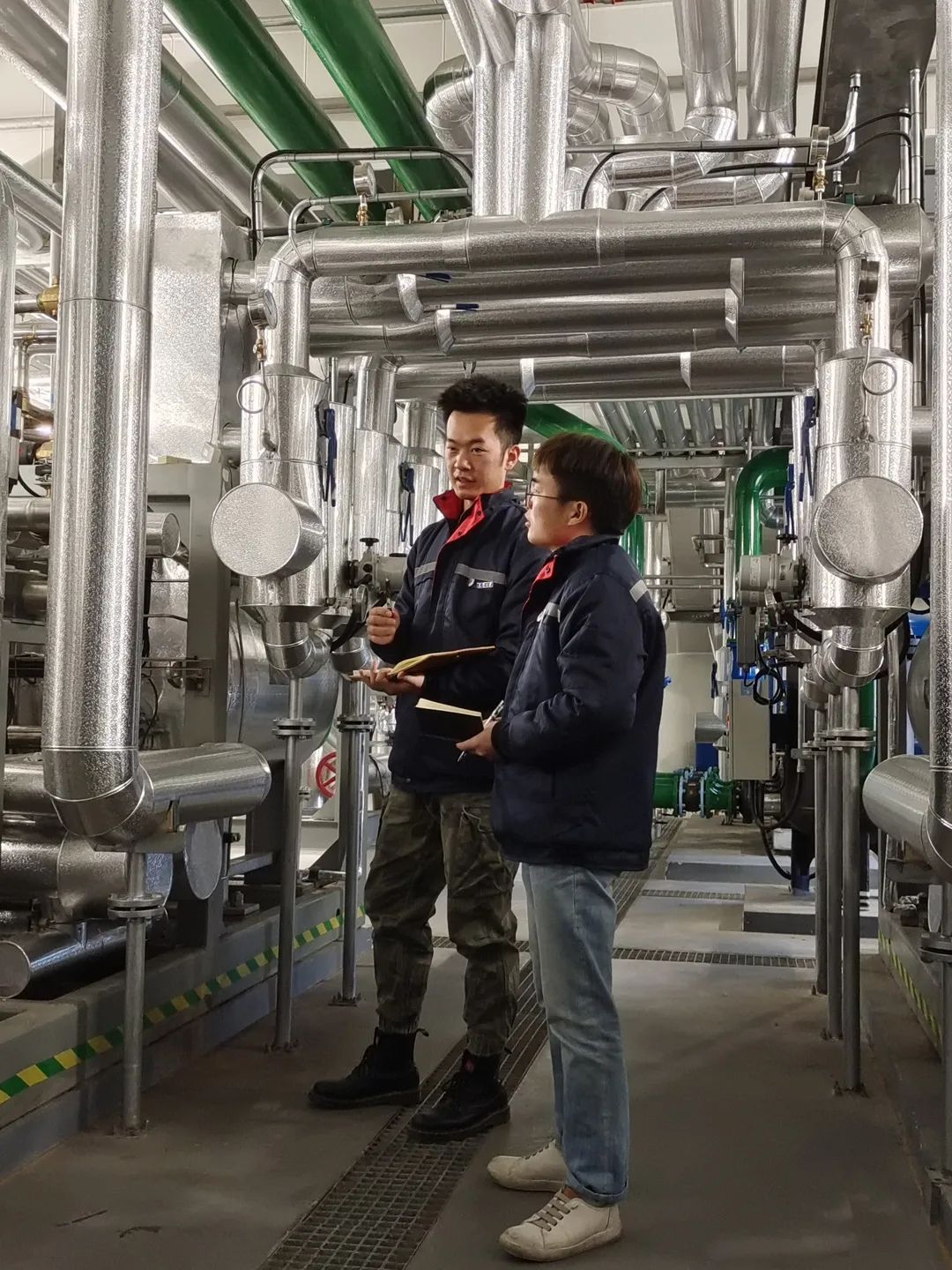 项目成员在二氧化碳跨临界直冷制冰系统机房。“我们的制冰系统可以更好地控制冰面的温差。” 刘楷告诉科技日报记者,系统可以实现在1800平方米的冰场上,实际冰面温差只有0.3度,最佳时可达0.1度,冰面温度非常均匀。