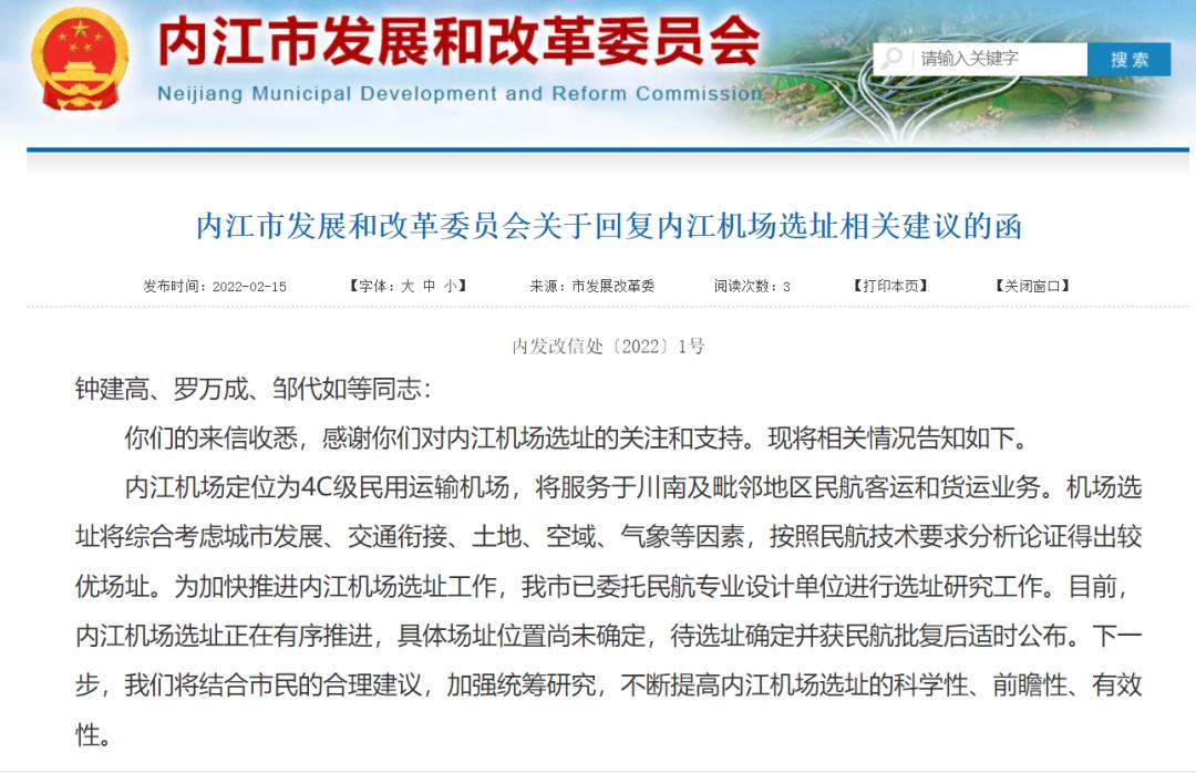 今年1月,中国民用航空局、国家发展和改革委、交通运输部联合发布《“十四五”民用航空发展规划》,内江机场列入全国“十四五”时期运输机场重点建设项目,成为纳入全国推进前期工作的43个新建机场之一,也是四川开展前期工作的4个新建机场之一。据了解,