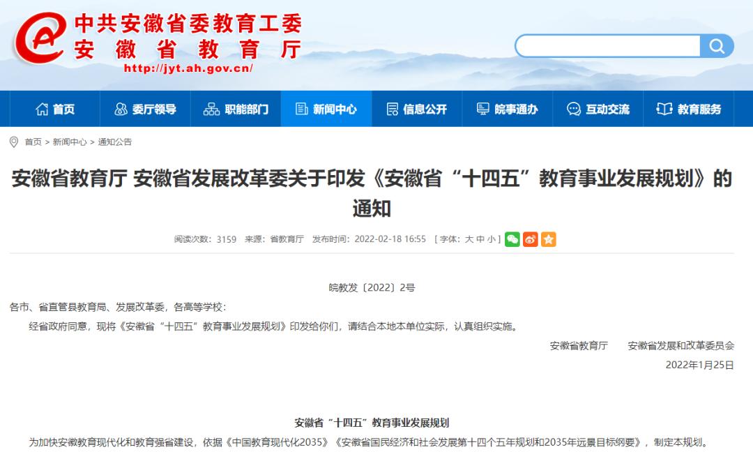2月18日,安徽省教育厅 安徽省发展改革委正式印发《安徽省“十四五”教育事业发展规划》(以下简称“《规划》”)。