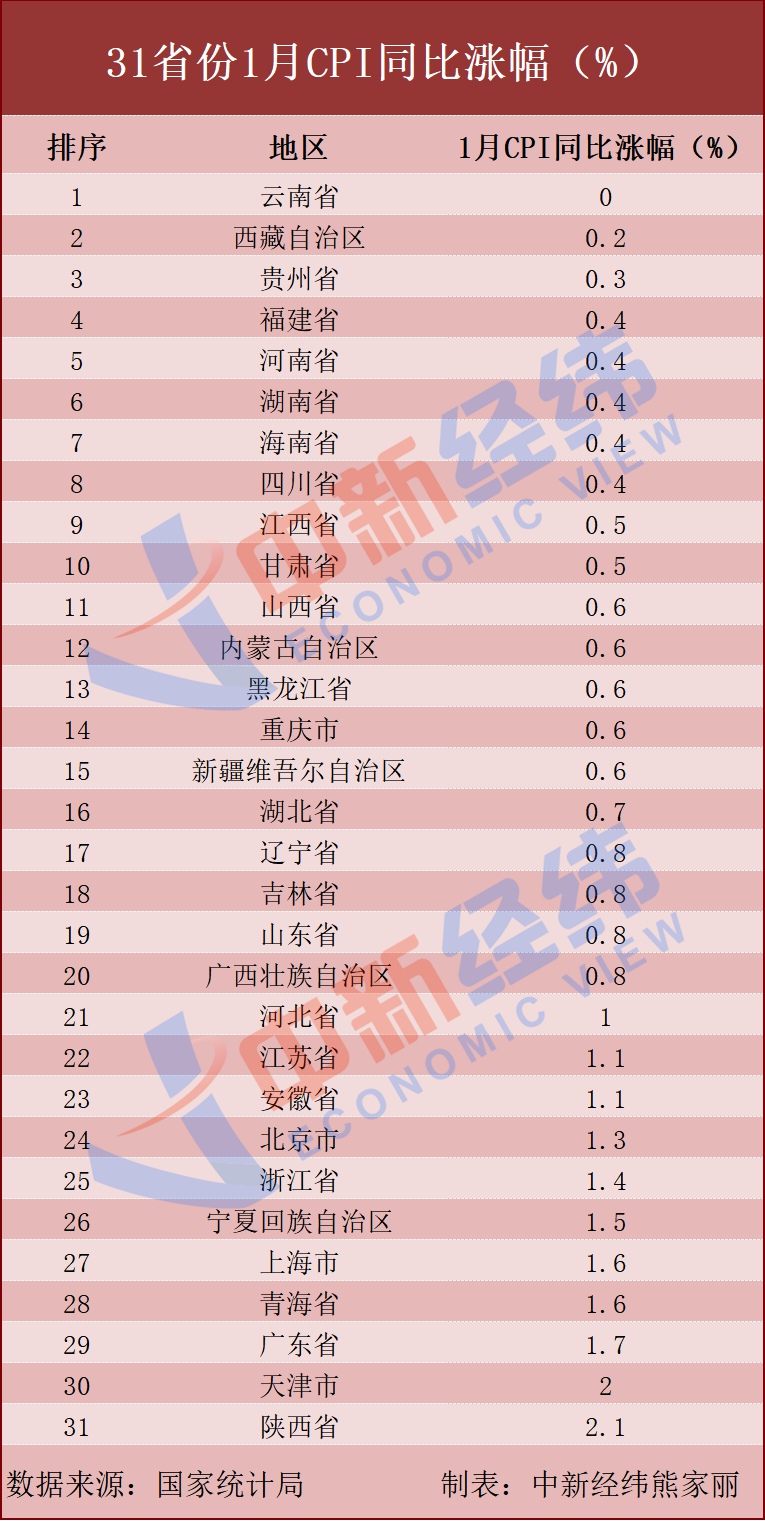 对比31省份数据,河北、江苏、安徽、北京、浙江、宁夏、上海、青海、广东、天津、陕西这11省份1月CPI同比涨幅超过全国水平,其中天津、陕西2省份涨幅达2%,分别为2%、2.1%。其余20省份CPI同比涨幅均低于全国水平,其中云南涨幅为0,物价与上月持平。