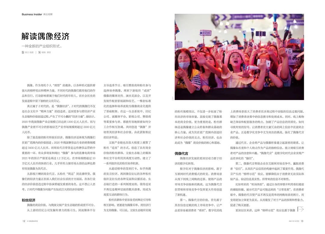 偶像,作为寄托个人“理想”的载体,以各种形式提供着强大的榜样效应和精神力量。不同时代的偶像们都用他们的作品和言行,打动影响着属于他们时代的年轻人,在社会历史的发展进程中留下独特的文化印记。真正属于Z世代的,是“偶像经济”。Z世代的偶像们不仅是社会文化中“精神力量”的创造者,还深度参与着经济产业生态链和价值创造过程,产生了不可小觑的“经济力量”。