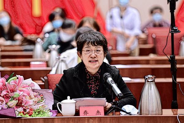 2020年5月7日,全国妇联召开座谈会,学习抗疫巾帼英雄先进事迹,激励广大妇女学习先进、争当最美巾帼奋斗者。乔杰在发言中。摄影:樊文军、杨睿乔杰的回忆充满了温暖。在2020年抗击新冠肺炎疫情的“战疫”中,全国4.26万名医务人员驰援湖北。乔杰还记得,医护人员们在条件有限制的情况下,还充分发挥出每个人的创造性。