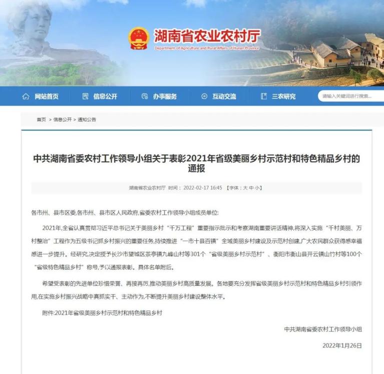 近日,湖南省农业农村厅发布中共湖南省委农村工作领导小组关于表彰2021年省级美丽乡村示范村和特色精品乡村的通报,决定授予长沙市长沙县黄兴会展经济区车马村等301个“省级美丽乡村示范村”、长沙市长沙县金井镇金龙村等100个“省级特色精品乡村”称号,予以通报表彰。其中长沙县有5个村上榜“省级美丽乡村示范村”、2个村上榜“省级特色精品乡村”。