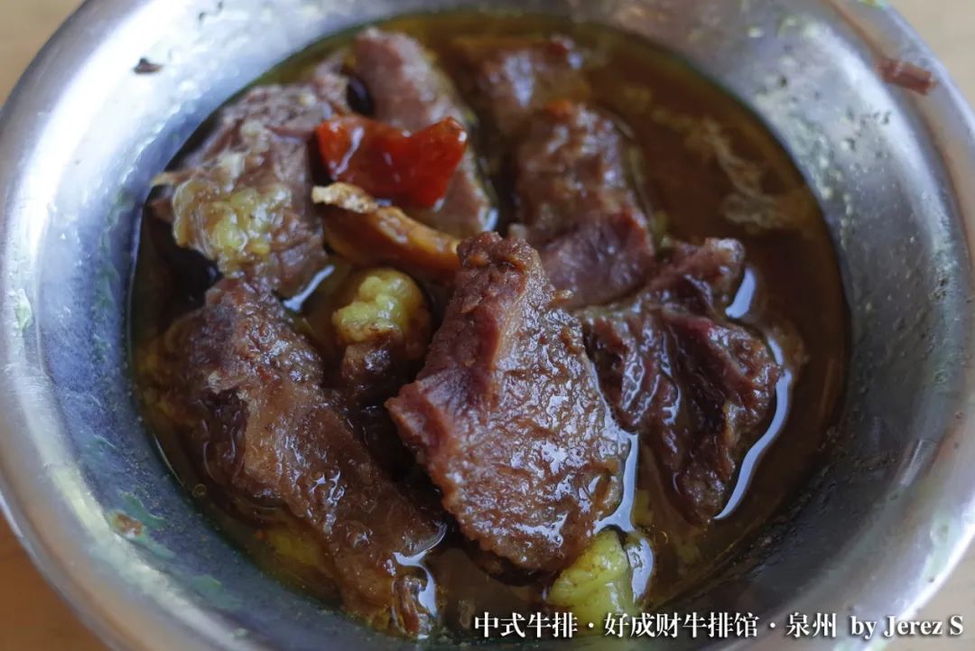 泉州的中式牛排,就是在这样一种中外交融的饮食文化中诞生的产物。虽然名为牛排,但和我们在西餐店里用刀叉吃的牛排不同,泉州的牛排指的是牛排骨,用料一般取自当地的黄牛。初尝中式牛排,复杂的香气和微微黏稠的汤汁,让一个词猛然蹦进了我的脑子:“咖喱”。这感觉并没有出错,地道的泉州牛排真就有着淡淡的咖喱味。