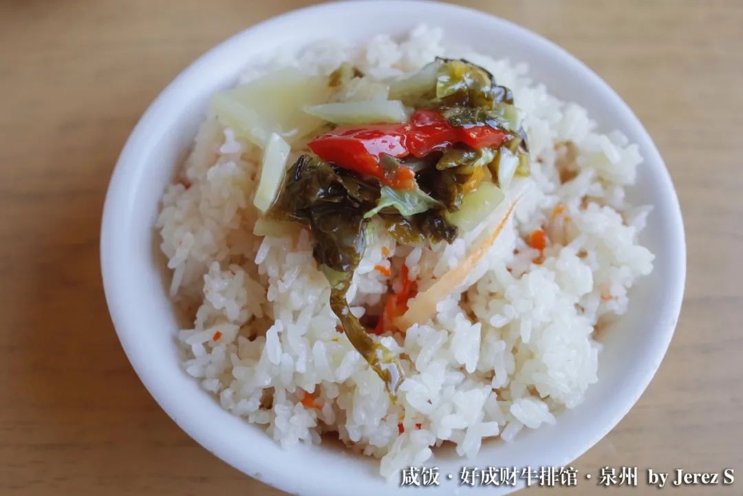顺便一提咸饭,这其实是整个闽南地区都十分喜欢的菜饭,把肉、菜和米同煮就成了。豪华的咸饭里,有猪肉粒、虾皮,还有饱满的香菇粒、胡萝卜丝、芥菜粒等等丰富的食材,一碗饭的丰富程度堪比一桌菜。而简易一些的,只要拌上香菇芥菜丁和萝卜丝,就够了。在米饭焖煮的过程中,每一种食材的香气和鲜味都融入到了米粒中,菜饭合一,不仅红绿相间色彩诱人,口味也丰富而令人满足。