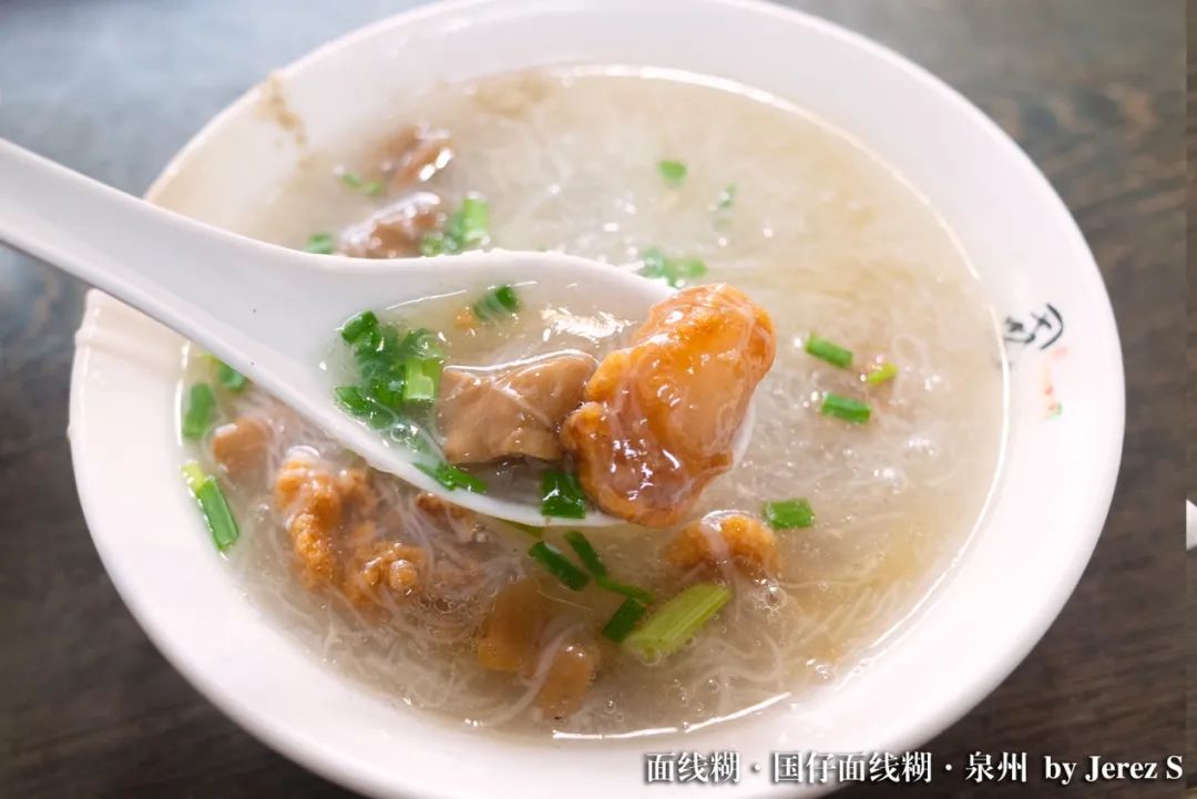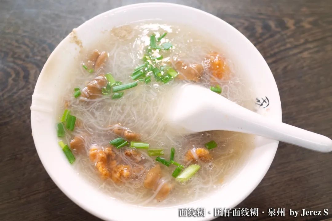 鲜甜,是第一个蹦进脑子的词,接着便是满脑子刷屏的:“好吃!好吃!真好吃!”说是吃,其实并不恰当。纯的面线糊,几乎是一碗醇厚的汤了。高汤的鲜美和面线的细腻都融入其中,顺滑地一口沿着勺子直接淌进心底,然后便是从四肢生出的舒适与温暖。白胡椒的微辣,让鲜美不落于单调,每一口都是熨帖至极。