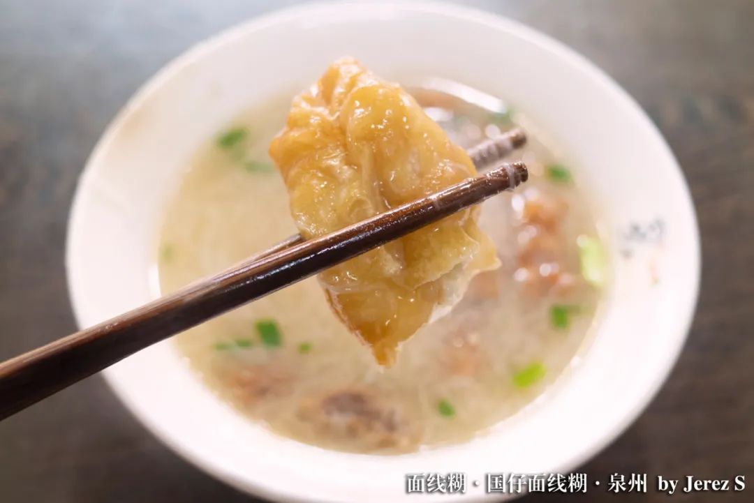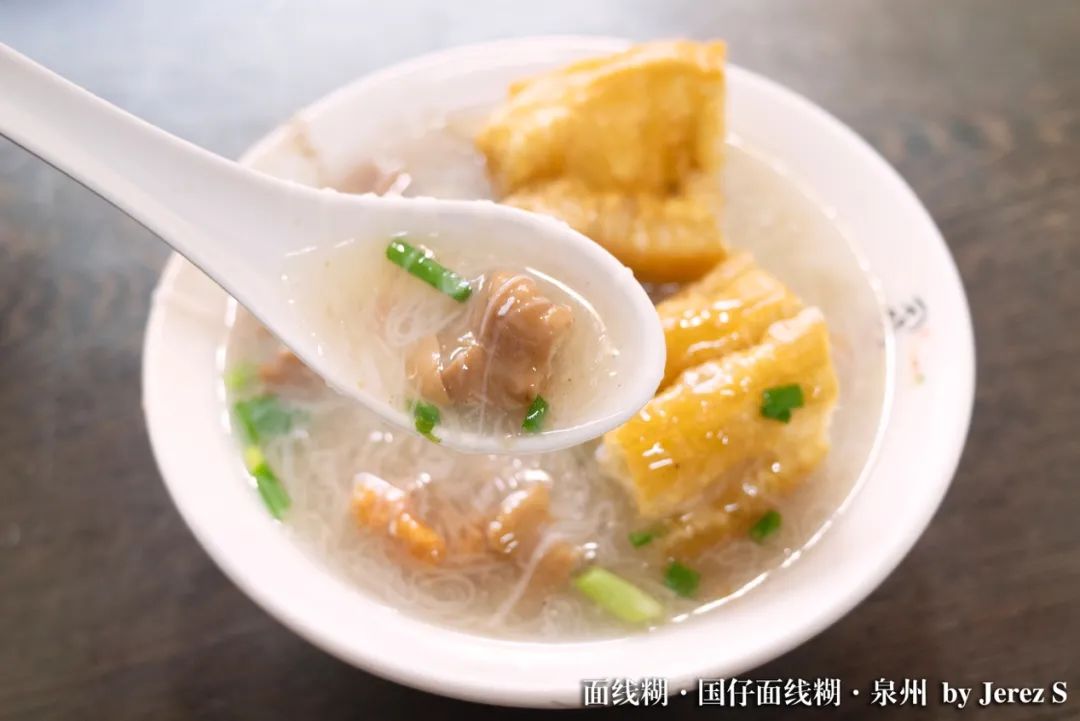 而油条,才是点睛之笔。当它吸收了面糊,半软不软时最是美味,口感软而不绵,每一口都有满满的鲜美汤汁迸发出来。如此迷人的口味,难怪这一碗小小的面线糊,几乎承包了泉州人的早餐时光。