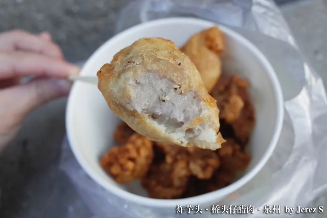 只看外表,它像极了火锅店里的小酥肉,但敲开金黄外壳的门,内里的肉块滋味却大不相同,每一丝肉鲜味都有微微的酸味,这味道并不十分突出,只是肉香上轻描淡写的一笔。但就是这么浅淡的酸,却宛如点睛之笔,解了油炸的腻,也让肉香更为清爽。泉州醋肉做得最出名的店,下午三点才营业,一开门就会排起小队,足见当地人的喜爱。除了醋肉,出镜率极高的芋头再次出场,炸芋头又软又嫩又香甜,一口肉一口芋头,十分过瘾。