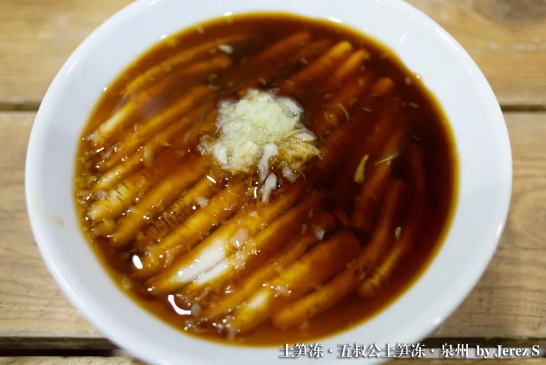 土笋富含胶原蛋白,所以当地人会将它熬煮后提取其中的胶质,再将被榨干的土笋和汤一起冻成冻。吃的时候,淋上一勺蒜、酱油、醋调和成的料汁就行了。