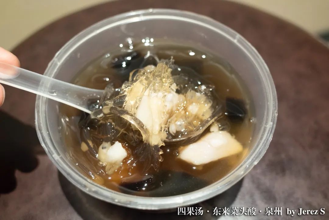 吃过酸嘢的我,对菜头酸也算得上是接受良好了,但萝卜水,真就是勇者的尝试了。又酸又甜还有点咸,一口下肚,头皮发麻。如果在热到脑壳发晕的夏天来上这么一口,应该相当解暑,但可惜我去时是清冷的冬季,不太能消受得起。好在机智的我顺手买了四果汤,清爽甘甜的口感救我狗命。四果汤,也是传统甜品,其中最特别最经典的,一定要属石花膏了。