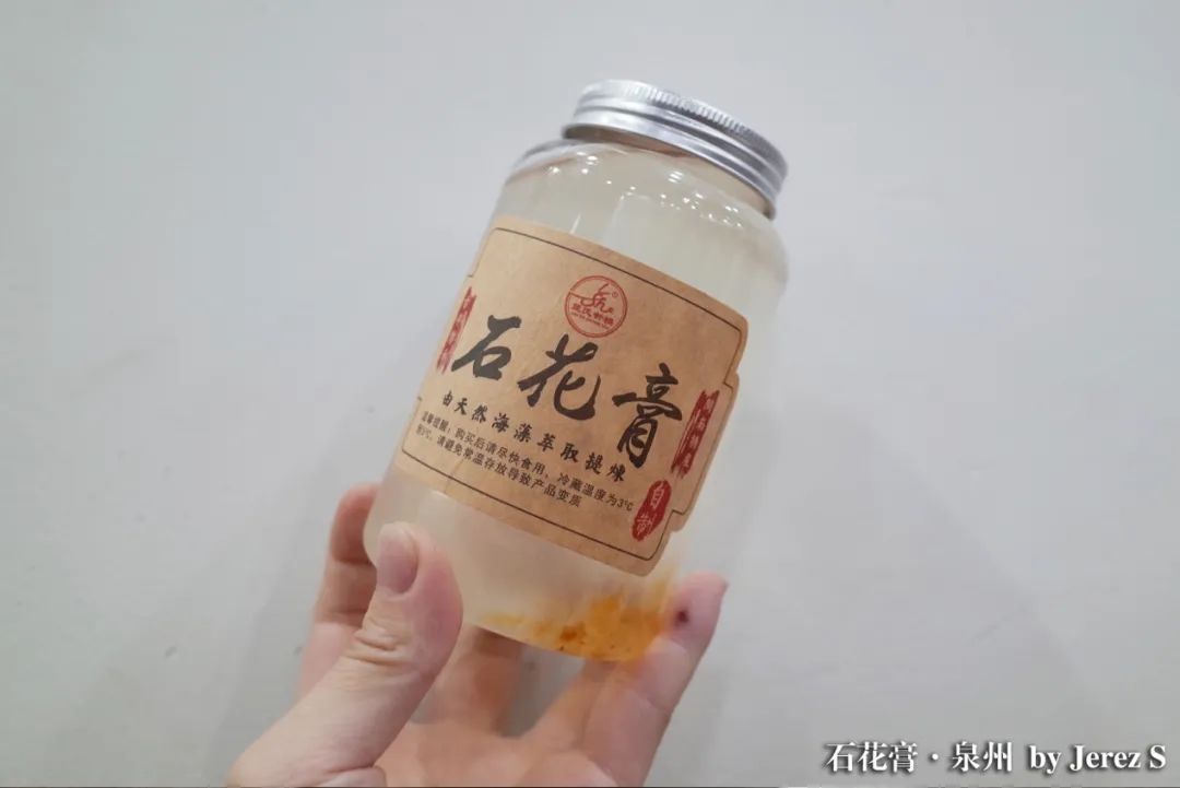 石花膏有点类似果冻或者冰粉,但原材料是海边才会生长的石花菜(一种海藻),其中含有丰富的琼脂,可以制成QQ弹弹的冻。制成“冻”状的石花膏一般会刨成条状方便食用。比起果冻,石花口感更为脆滑,稍有点儿韧性,不能直接“吸”着吃,需要用点儿牙才行。除了四果汤,街边也常有单瓶的石花膏卖,冰爽又清甜。