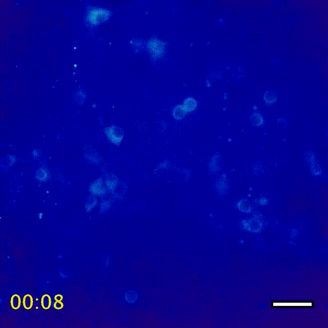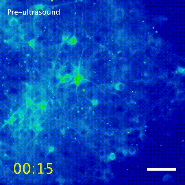 无图无真相,给大家看一个会动的。超声刺激后,HEK细胞内钙离子水平骤升,在钙指示剂作用下红得发光!(i荧光蛋白就是我!)