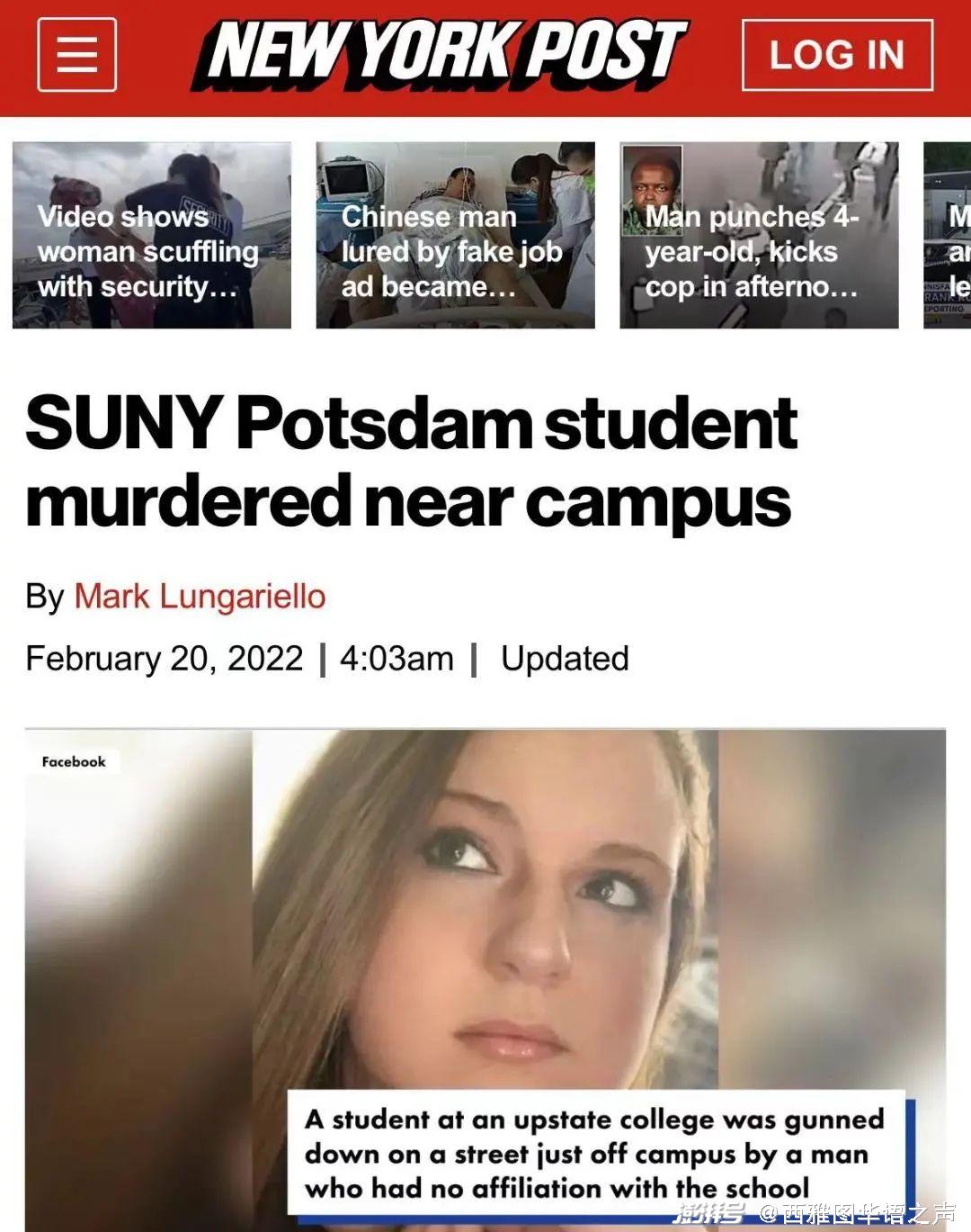【纽约邮报】美国校园枪击案频传,上周14日正逢2018年佛罗里达校园枪击案满四周年,美国总统拜登(Joe Biden)更呼吁“终结所有枪支暴力”。然而,稍早纽约波茨坦大学(SUNY Potsdam)传出一名音乐系才女倒卧在校园旁的街道上,警方到场时发现女同学身上有枪伤,已经没有生命迹象。