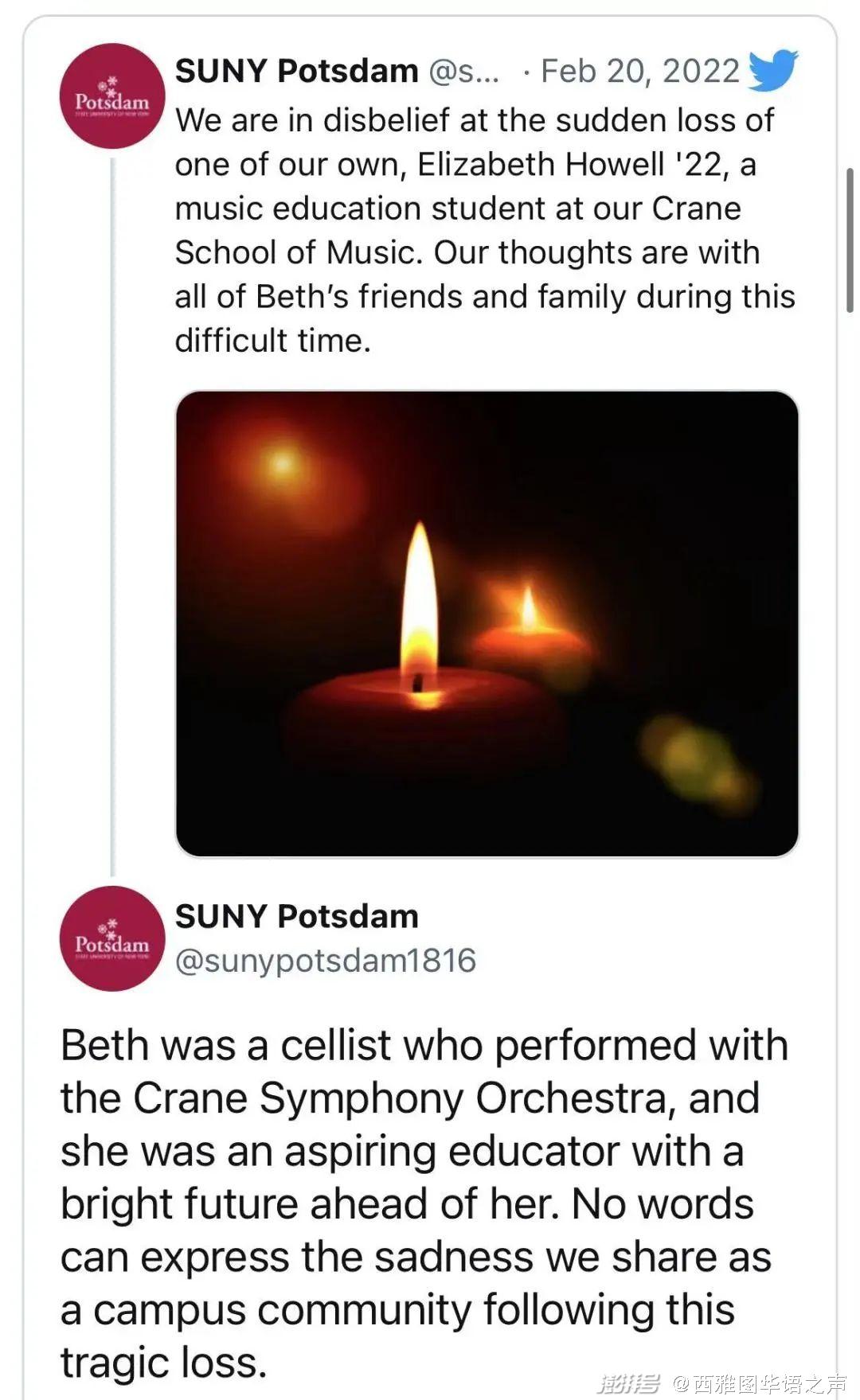 纽约波茨坦大学(SUNY Potsdam)音乐学院大约有700名学生。校方也在推特上PO出烛火点燃的照片追悼伊丽莎白,写下:“对于伊丽莎白骤逝所有人都难以置信,她是如此杰出的音乐家,我们永远与你同在。”