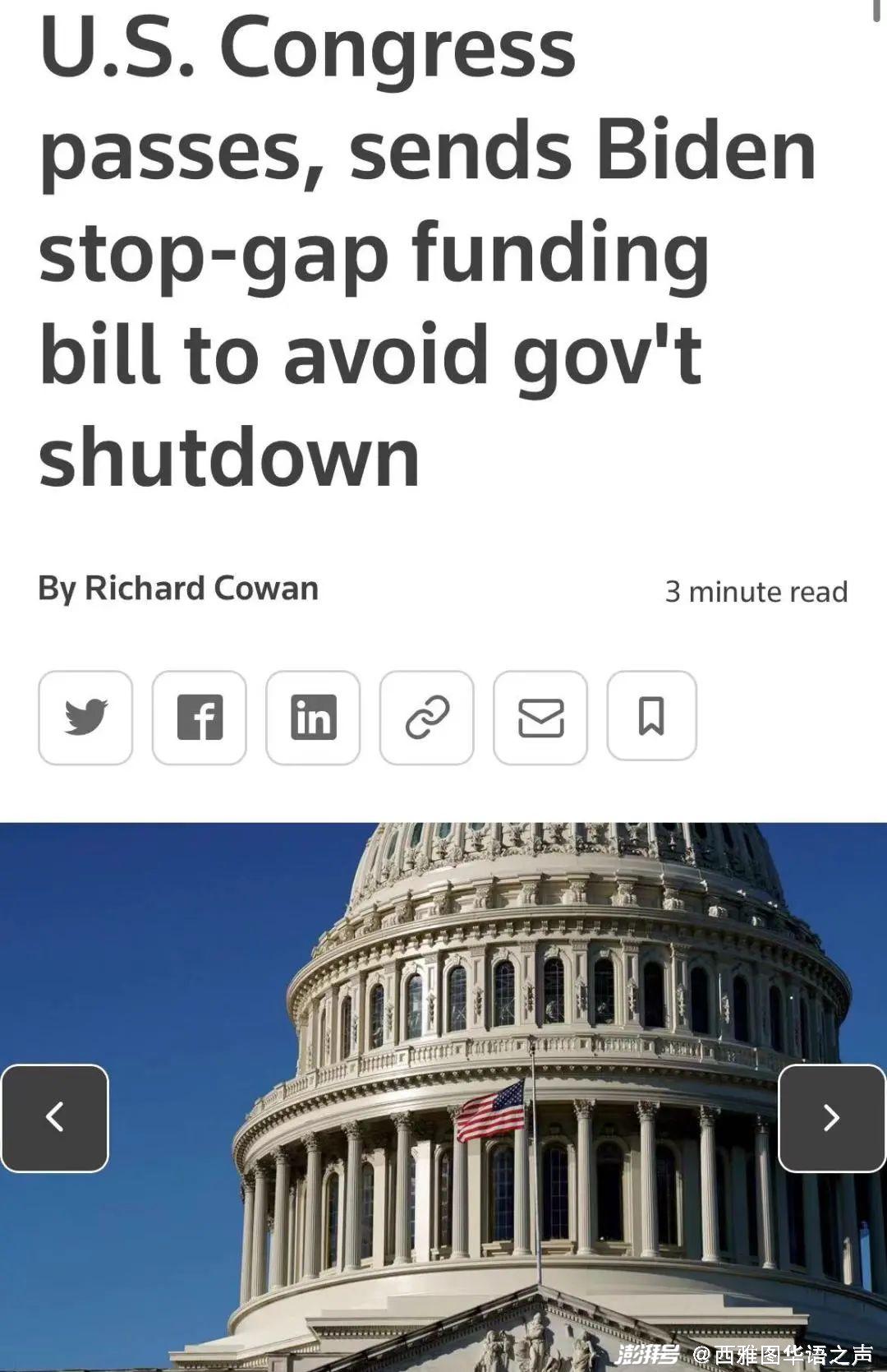 【路透社】美国总统拜登近日正式签署了美国国会参议院通过的临时拨款法案,确保联邦政府有足够资金继续运转到3月11日,暂时避免了联邦政府停摆的窘境。
