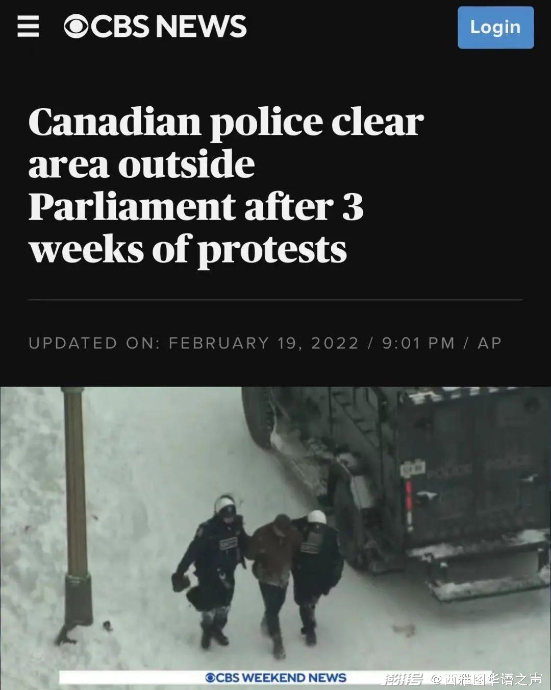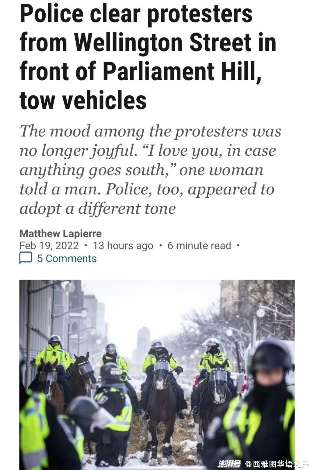 【CBS】截至昨日下午5时左右,加拿大警方已经将抗议者驱赶到威灵顿大街以外的街区。此前占据威灵顿大街的卡车司机也陆续撤离,警方还调用拖车拖走了38辆车。在驱赶抗议者的过程中,警方不仅出动了携带武器的特警、骑警,还使用了辣椒喷雾剂等。