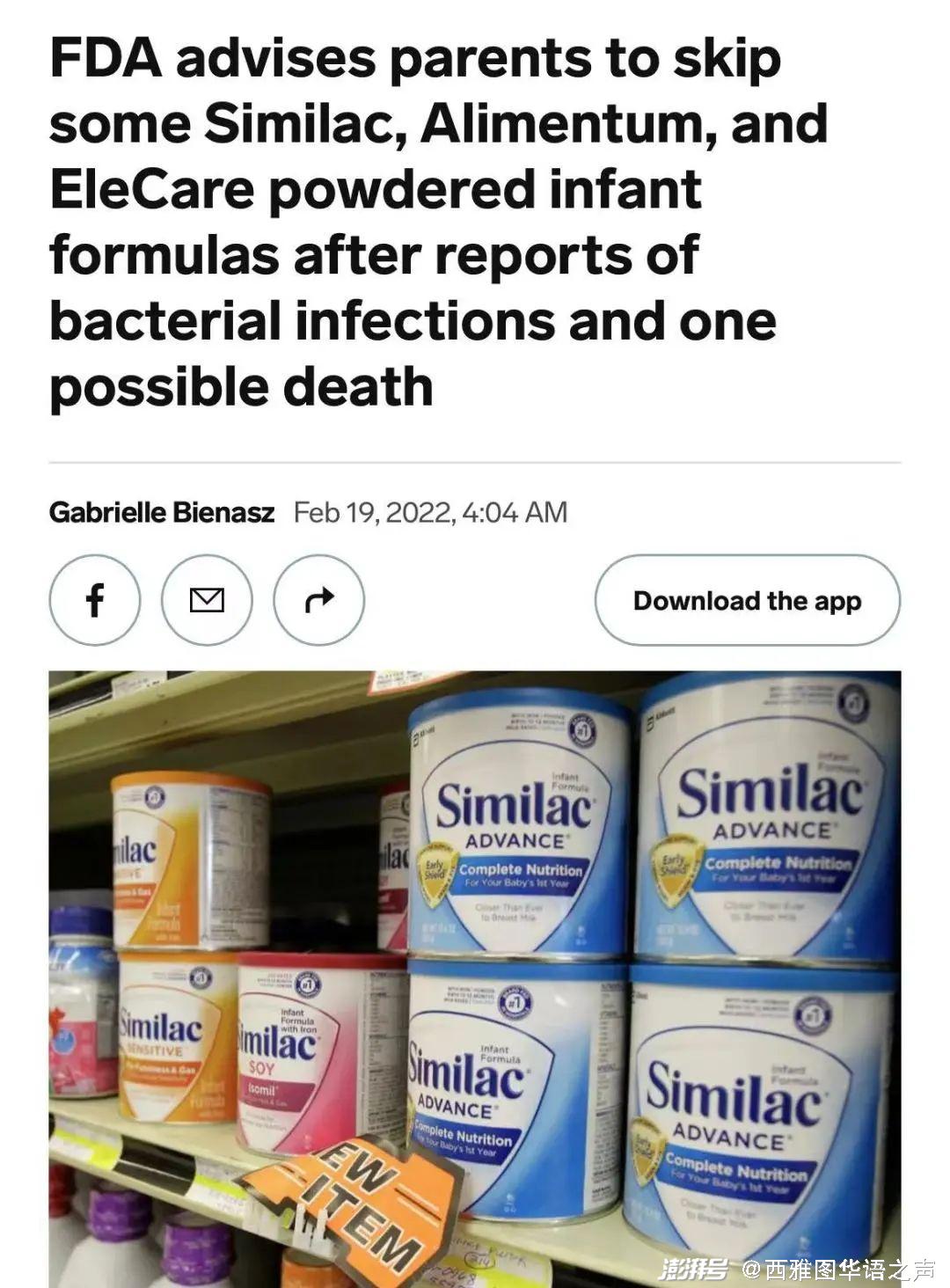 据报道,3名婴儿的感染源于克罗诺杆菌(Cronobacter),这种细菌可以导致严重的、危及生命的感染,还可能导致脑膜炎。另外还有一种感染由沙门氏菌引起,这是一种可以引发消化系统疾病和发烧的细菌。FDA指出,人们应该避免使用批号前两位数字在22到37之间,容器上的批号包含K8、SH或者Z2,有效期为2022年4月1日或者更晚的雅培Alimentum和EleCare奶粉。