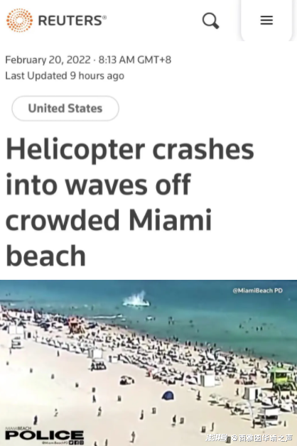 7、惊险!美国迈阿密海滩一直升机在游客面前一头栽进海里