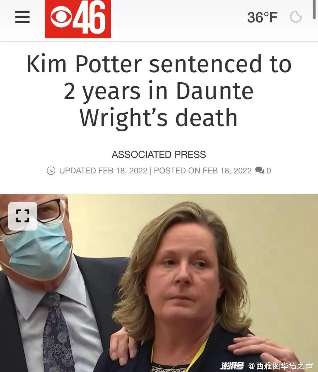 【CBS】全美关注的明尼苏达州前警员金·波特(Kim Potter)开枪射杀非裔男子丹特·赖特(Daunte Wright)一案量刑结果近日正式出炉。法庭判决两项过失杀人罪成立的波特2年刑期,这一量刑结果远低于此前检方要求的至少7年2个月刑期。