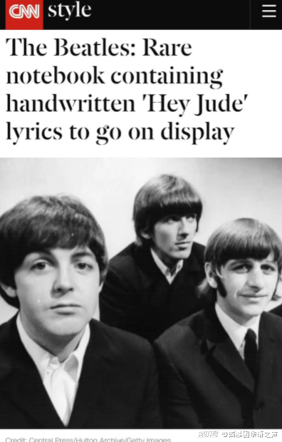 【CNN】一本见证英国传奇乐队披头士(The Beatles)辉煌时代的手写笔记本,当地时间22日开始将在利物浦的披头士故事馆公开展出。笔记本原属该乐队的巡唱经理人埃文斯(Mal Evans)所有,其中尤以保罗麦卡尼为金曲《Hey Jude》手写的歌词草稿最为珍贵。笔记于1967至68年间编写,披头士大事记顾问专家梅考克表示,这笔记能看到披头士的音乐创作过程。