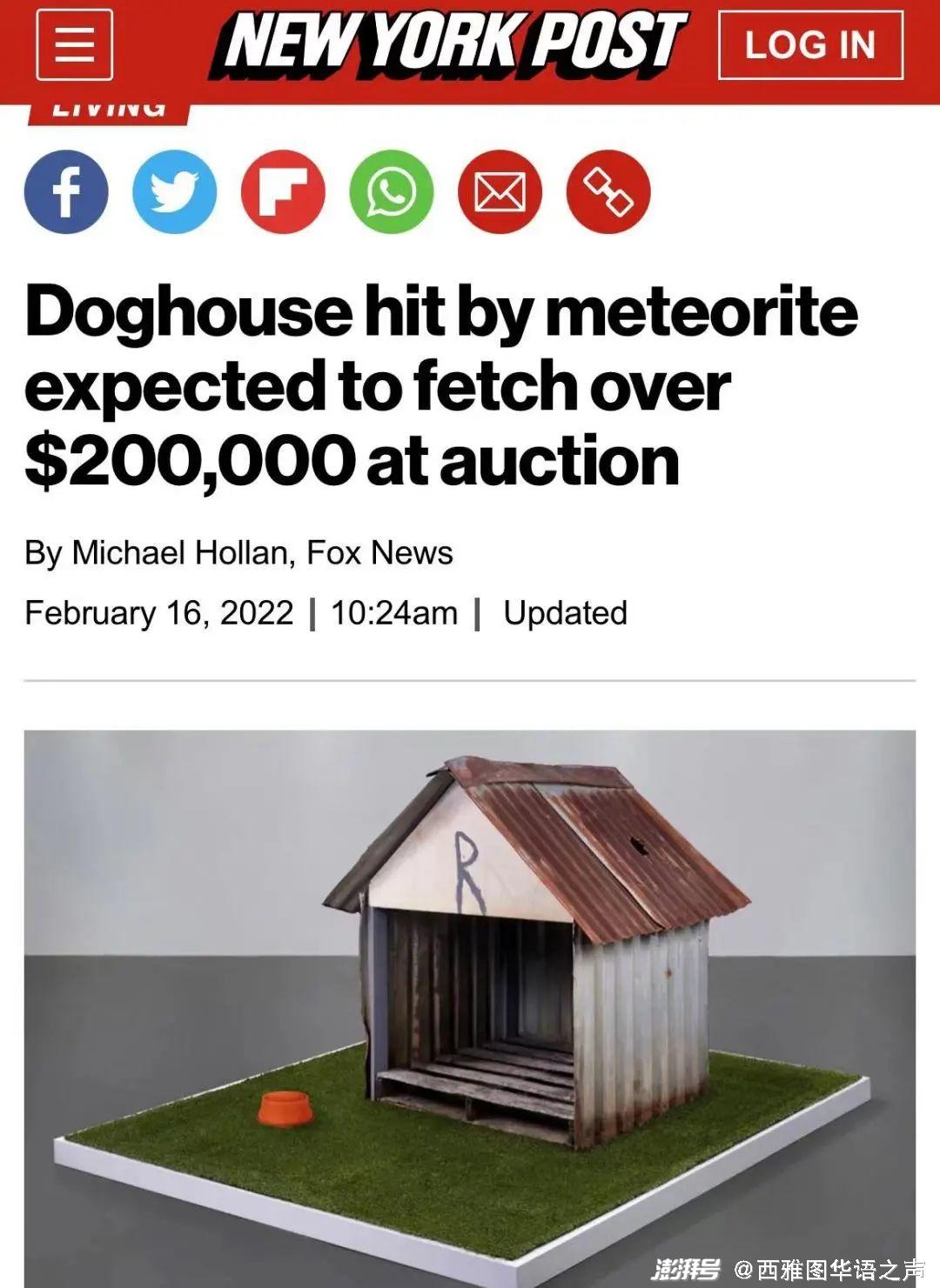 【纽约邮报】哥斯达黎加一间狗屋3年前遭陨石击中屋顶,狗狗幸运逃过一劫,但狗屋留下陨石撞击痕迹。主人近日将狗屋和陨石拍卖,有趣的是狗屋估价可达30万美元,比陨石的6万美元高。