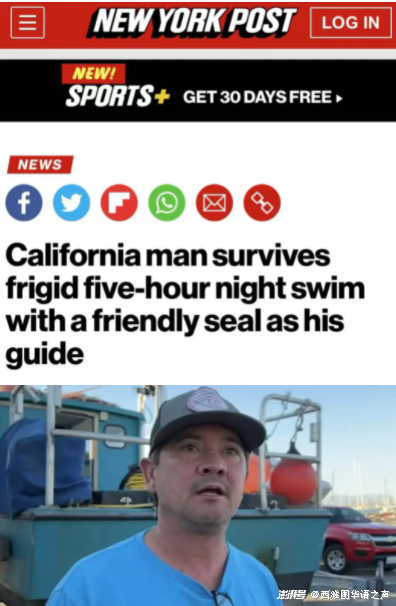 【纽约邮报】美国加州男子汤普森(Scott Thompson)近日搭船出海时不小心掉入海中,由于当时是深夜,身上又只有穿着T恤和短裤,正以为自己会因为失温冻死时,突然出现一条友善海豹上前帮助他,让他受困5小时后成功上岸。