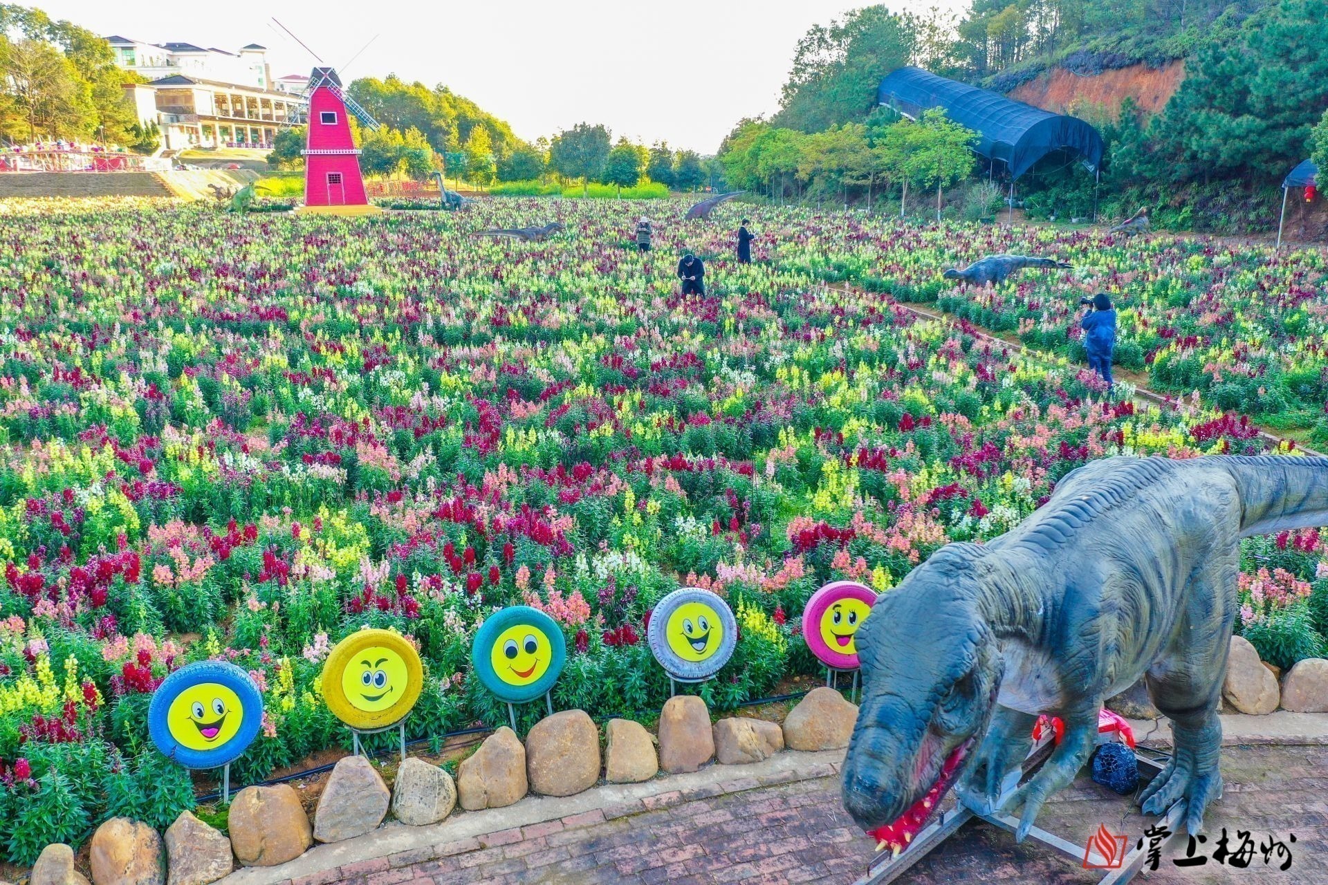 在梅县区南口镇麓湖山景区时花广场,亦是满园春色,粉红色、红色、黄色、白色等近20亩的各色金鱼草开满整个花田,呈现出的花海效果洋溢着春天的气息。据景区工作人员介绍,金鱼草的花期将持续到5月,色彩绚丽的金鱼草花吸引了许多游客前来踏青赏花,不少摄影爱好者还特意带了“长枪短炮”给花田拍照,留住春天的美丽。
