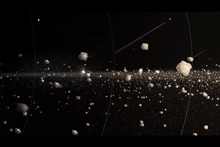 “指环王”的王者气势可不一般。土星的光环是太阳系中最大最亮的,整个行星环系统的跨度可达2600万千米,以土星为中心向外延伸超过28万千米,距离相当于6个地球手拉手。光环由不计其数的颗粒组成,主要是水冰,尘埃和岩石,大小从微米到米不等,有的比一辆小汽车还要大。其中水冰占据了所有光环物质的95%以上,它们的反照率很高,所以土星环看起来十分明亮。这些颗粒在重力的作用下围绕着土星运转,放大后看起来,就像波光粼粼的海面。