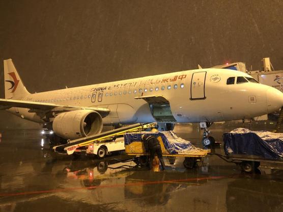 在昌北国际机场地勤人员冒着风雪为机翼除冰