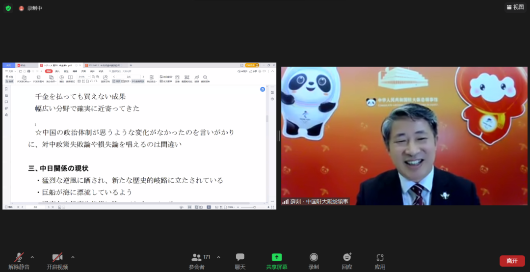2月17日,驻大阪总领事薛剑应邀在神奈川县日中友好协会主办的线上讲座发表演讲。包括神奈川县友协在内日本多地友好团体成员及中日两国智库、媒体、企业等各界相关人士近200人参会。薛剑在演讲中全面介绍了对中日关系50年发展的看法及未来展望,并就日本今后对华外交提出相关意见。