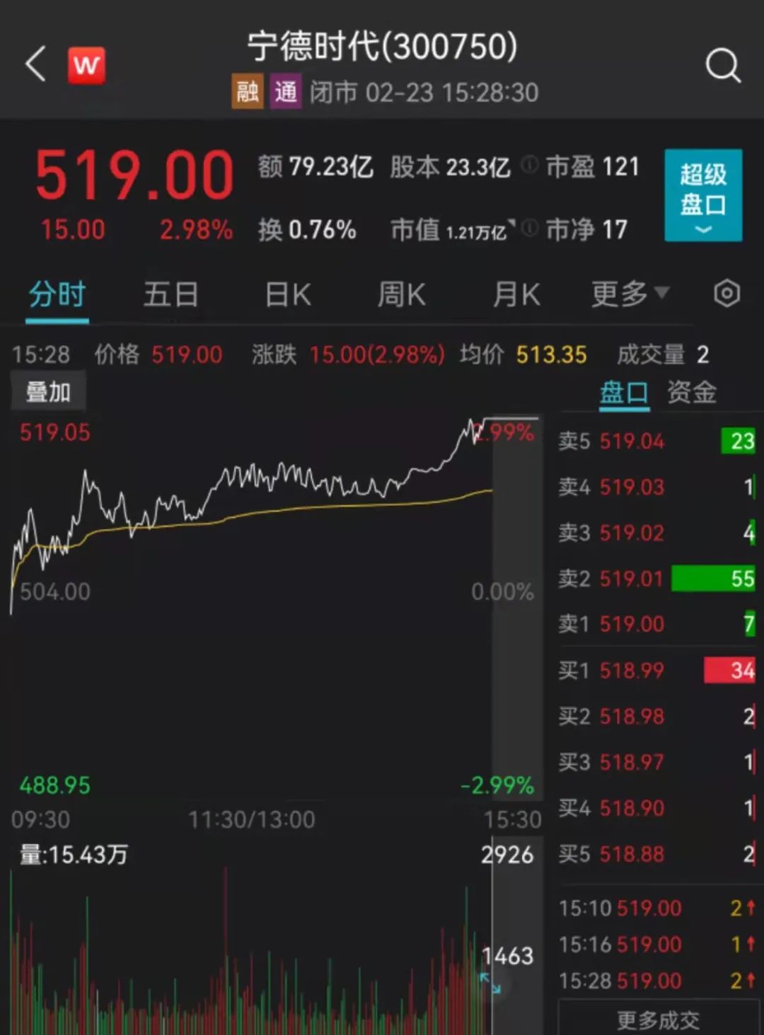 “宁王”宁德时代强势上涨近3%,总市值超1.2万亿元。