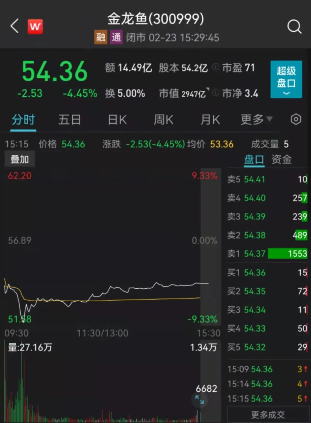“油茅”金龙鱼昨日公布快报,业绩不及预期,开盘后股价跳水,一度大跌9%,至收盘跌幅收窄至4.45%。