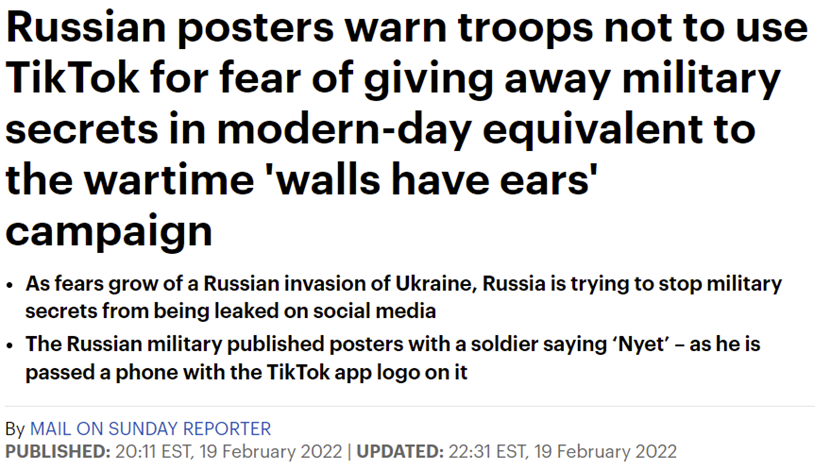 2月19日,英国《每日邮报》发文称,随着恐战情绪的蔓延,俄军发布了一系列海报,敦促士兵不要使用TikTok等社交平台,以免军事机密外泄。
