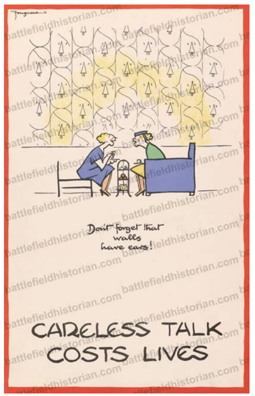 《每日邮报》声称,这张海报与二战时期发行的“隔墙有耳”海报相当,是俄罗斯安全部门发动 “广告运动”的一部分。1940年2月,英国《潘趣》(Punch)杂志美术编辑弗加斯(Fougasse)为英国信息部设计了一份宣传海报,以漫画形式警告民众——“不慎的交谈可能会牺牲生命。”