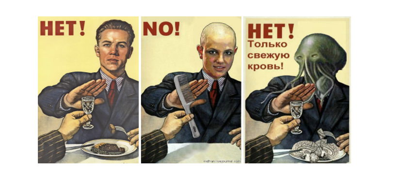 但可以确认的是,@COUPSURE在去年发布的这张海报,并非原创,而是一张苏联时期的经典反酒精海报的变形。上世纪50年代,苏联掀起了新一轮的反酒精运动,苏联艺术家戈沃尔科夫(Viktor Ivanovich Govorkov)在1954年创作了一幅男子在就餐时用手阻挡酒杯的宣传海报。据knowyourmeme网站介绍,这张海报在50余年后被网友重拾,经多次加工,成为了互联网梗图(Meme)文化的代表作品。