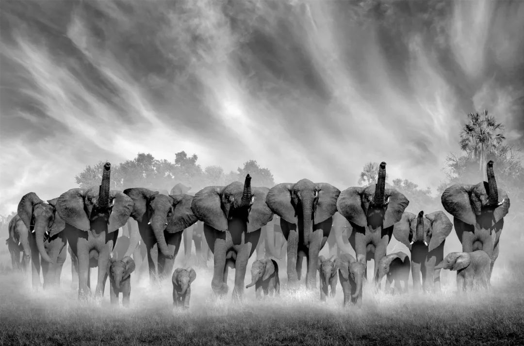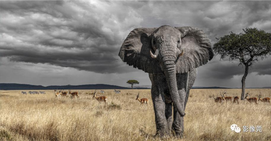 “当时我们离象群只有几十米,大象的鼻子已经竖起来了,代表它们已经生气了,它们向我们冲过来,我就趁机拍下了这个瞬间。”