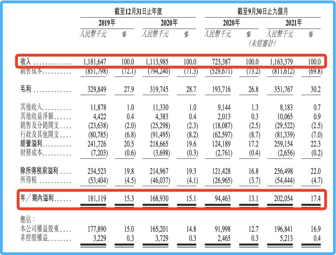 招股书显示,2019年、2020年和2021年前九个月,杨国福集团收入为11.82亿元、11.14亿元和11.63亿元;对应期内利润分别为1.81亿元、1.69亿元、2.02亿元。