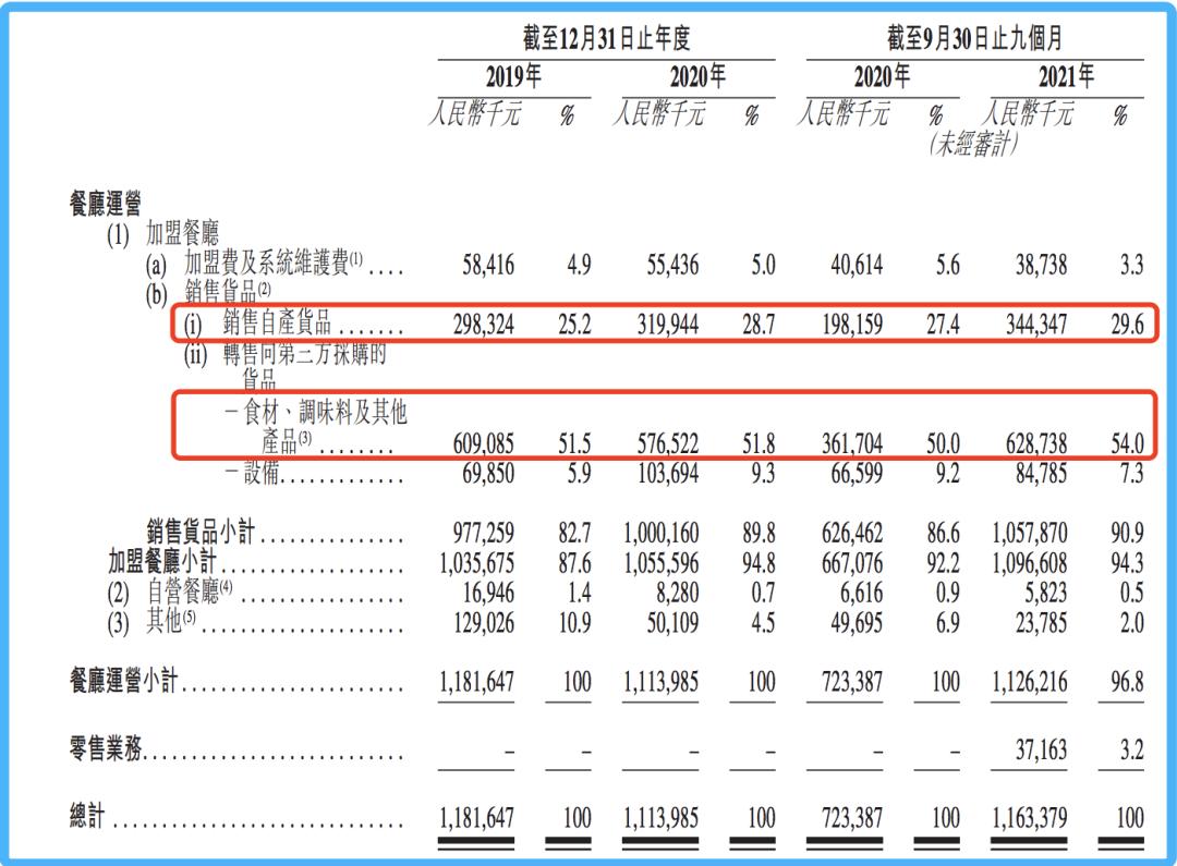 需要指出的是,杨国福集团收入大头并非来自单纯的加盟费收入,更多是向加盟店销售自产货品以及食材、调味料和其他产品获得的收入。这两部分收入占公司总收入的比重也在逐年增加,从2019年的76.7%增至2020年的80.5%,2021年前九个月这两个比重已经达到83.6%。