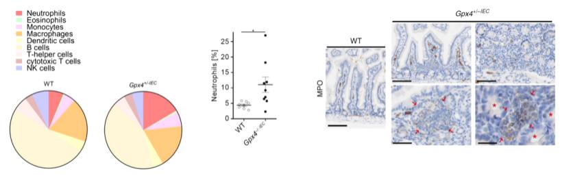 在IEC为Gpx4+/-的小鼠中,PUFA可诱发IEC中的LPO和局灶性肉芽肿样嗜中性粒细胞性肠炎(图6),补充α-生育酚(LPO清除剂)有缓解作用。